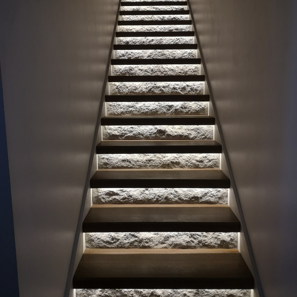 Trepp on paigaldatud siseruumi. Materjalideks metall, looduskivi, Led tuled, pähklispoon, liikumisandurid.
